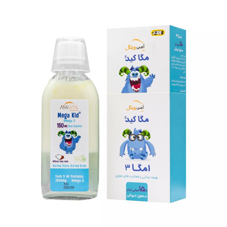 - شربت مگاکید امگا 3، حاوی 2/5 گرم روغن ماهی به ازای هر 5 میلی لیتر