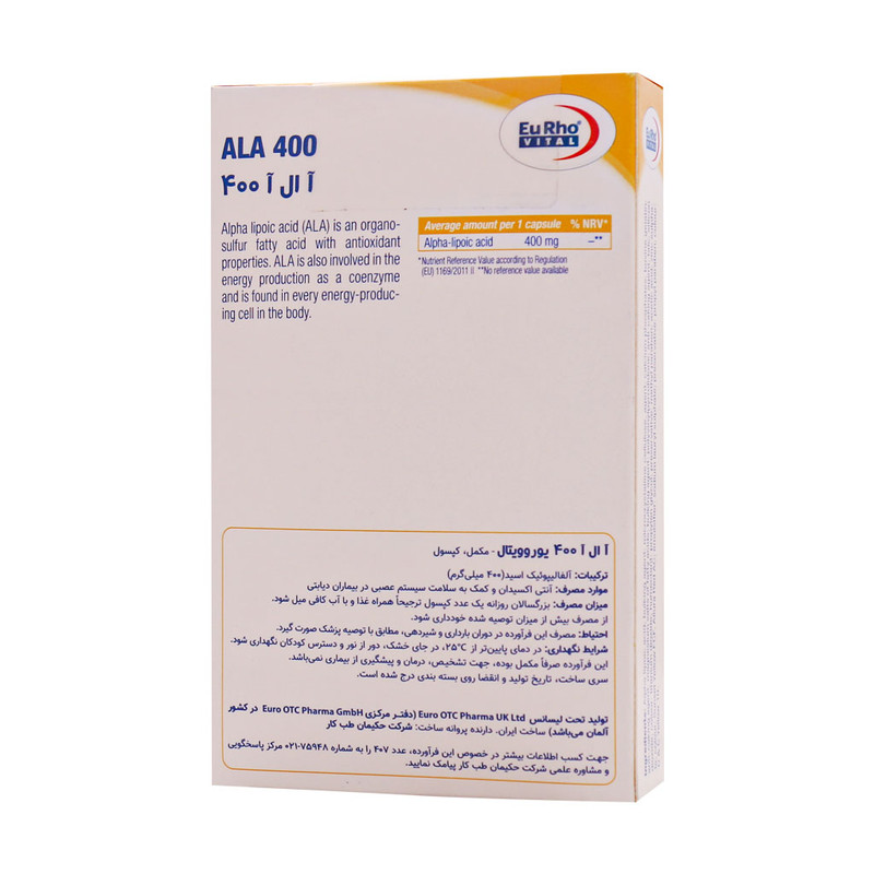 کپسول آ ال آ 400 یوروویتال حاوی 400 میلی گرم آنتی اکسیدان آلفا لیپوئیک اسید بوده که به درمان نوروپاتی دیابتی، بهبود عملکرد بدنسازان، تقویت حافظه و کنترل قند خون کمک میکند.
